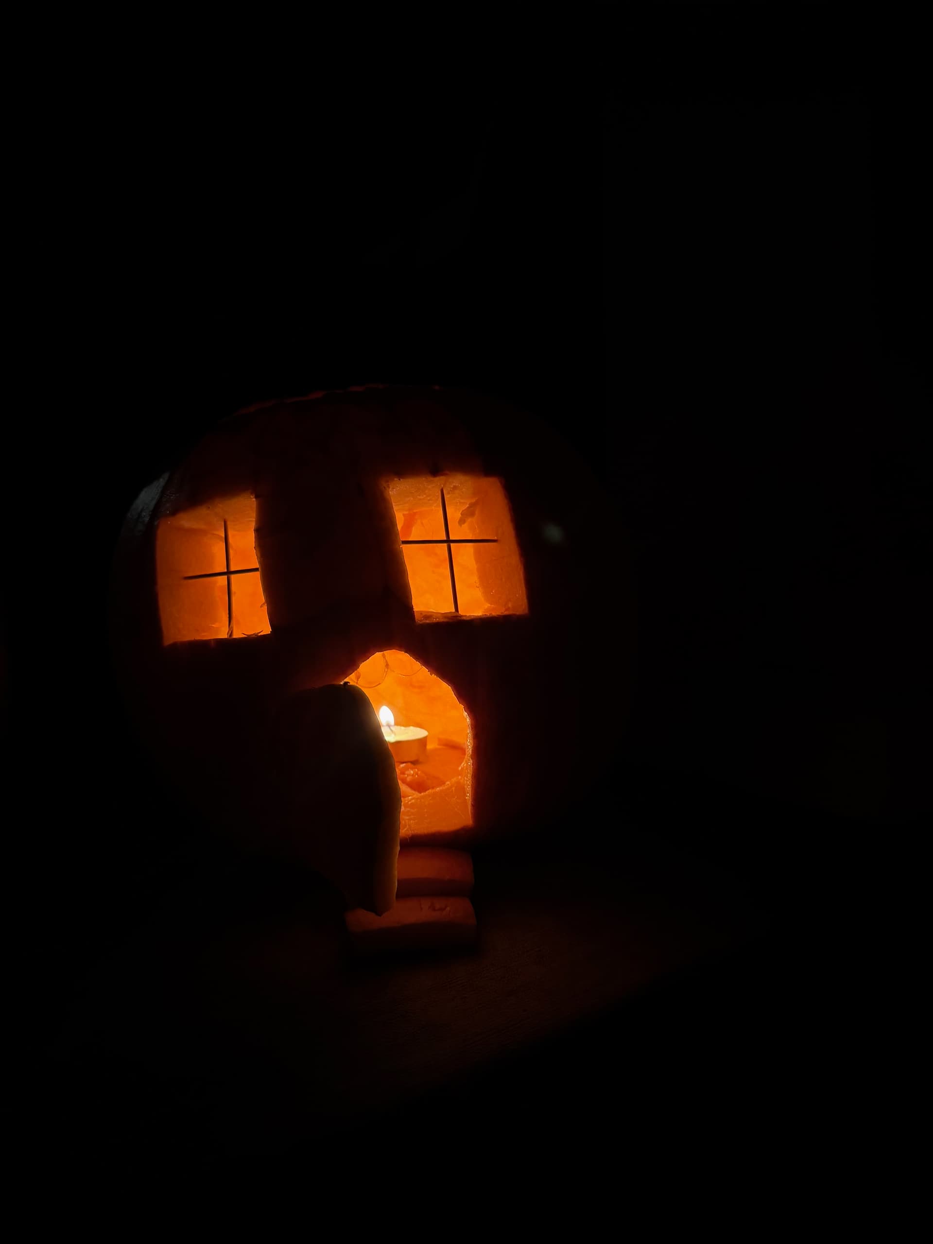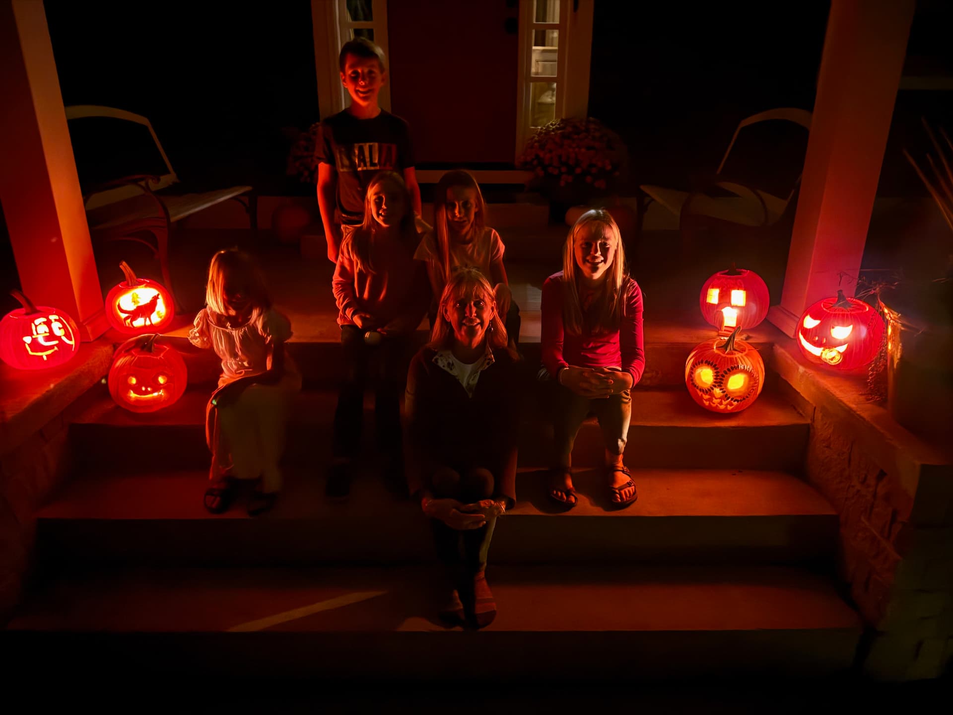 A home filled with children is a home filled with joy, and last night’s happiness was our kitchen island covered with severed pumpkin parts and seeds from all the pumpkins being carved. Afterwards we took them outside and lit the candles. (Zion is taking the pic.)