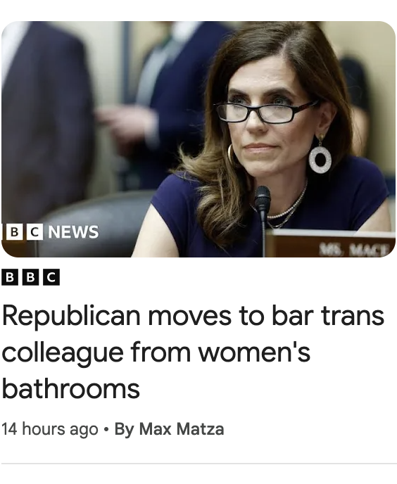 One commenter on media responded to post below about Congresswoman Nancy Mace (SC) having to fight to keep trans out of House womens bathroom saying “trans woman is a woman, not a man.” To which I responded: