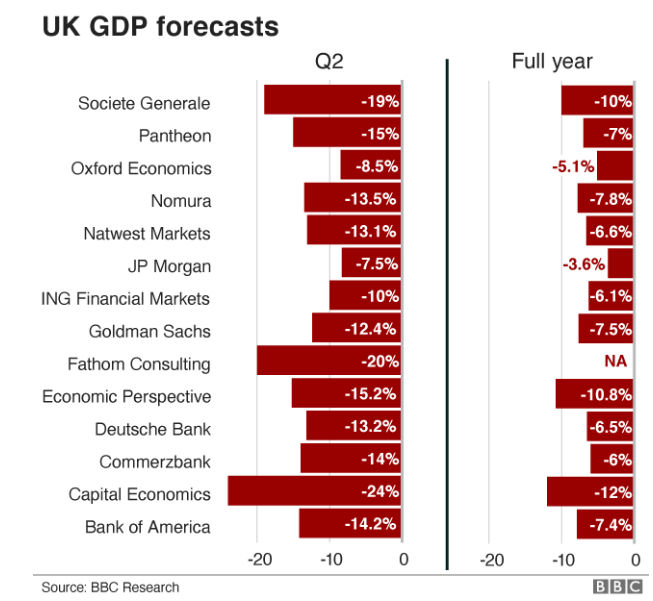#14 Initial data from Germany also suggests similar conclusion: “IFO Institute of Munich has recently concluded that a partial shutdown of 2 months duration will reduce German annual GDP by between 7.2 and 11.2 percentage points, while extending the period by a further month would cause annual GDP to fall by between 10 and 20.6%.” (p16)