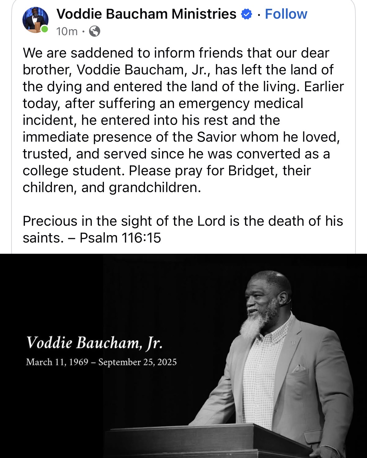 Years ago, our children went across the country recording Christian conferences, especially homeschooling conferences. They’d come home and tell us we’d love Voddie Baucham’s witness. Never heard him, but the Lord called him home today.